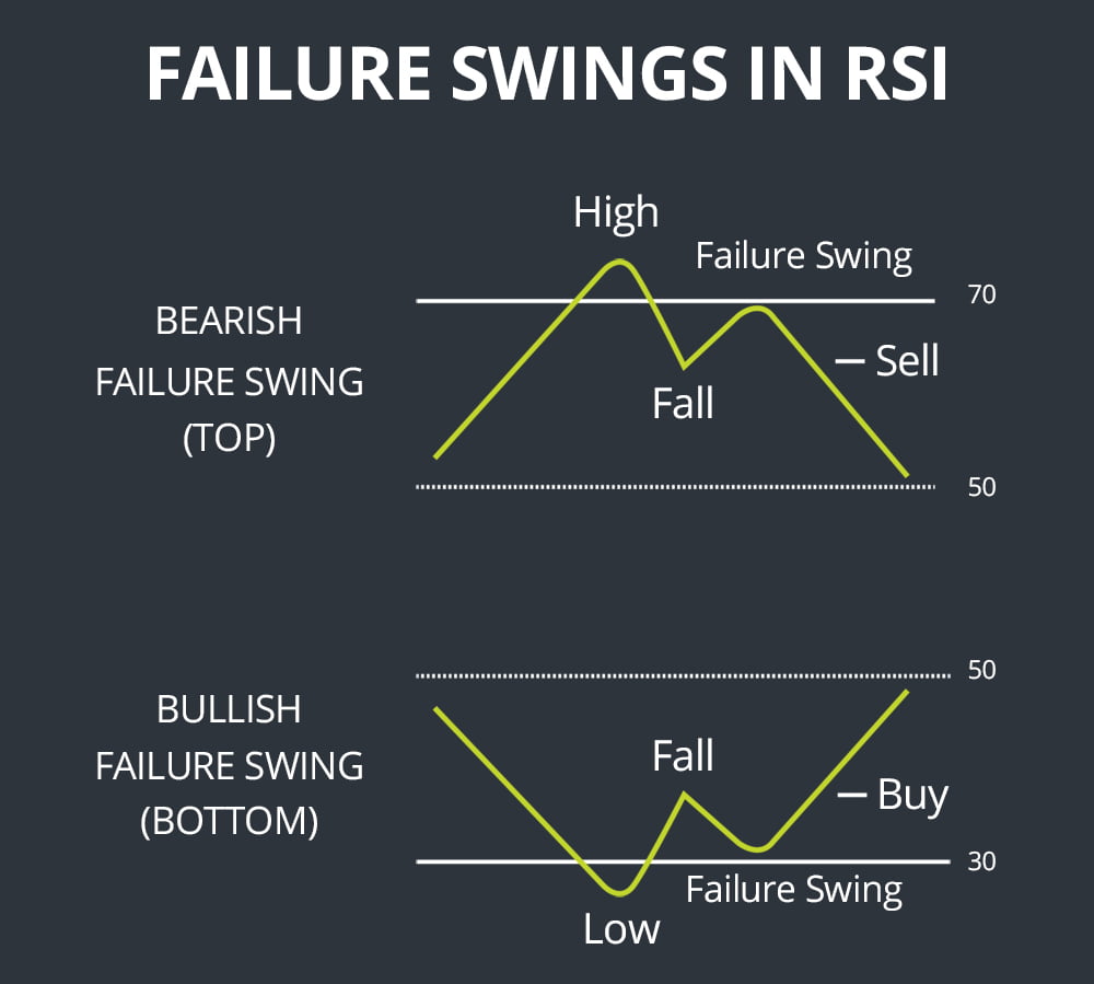 Failure swings are a pattern in the RSI itself, independent of price action, that can be used to identify when a reversal is likely to occur. A bullish failure swing occurs when the RSI drops just below 30 briefly and then bounces, before falling back down to hold just above 30. If the RSI bounces again and breaks its prior high, a failure swing is said to have occur and should predict a significant price movement. A bearish failure swing follows the opposite pattern around an RSI of 70, with the RSI bouncing below its previous low indicating a failure swing.