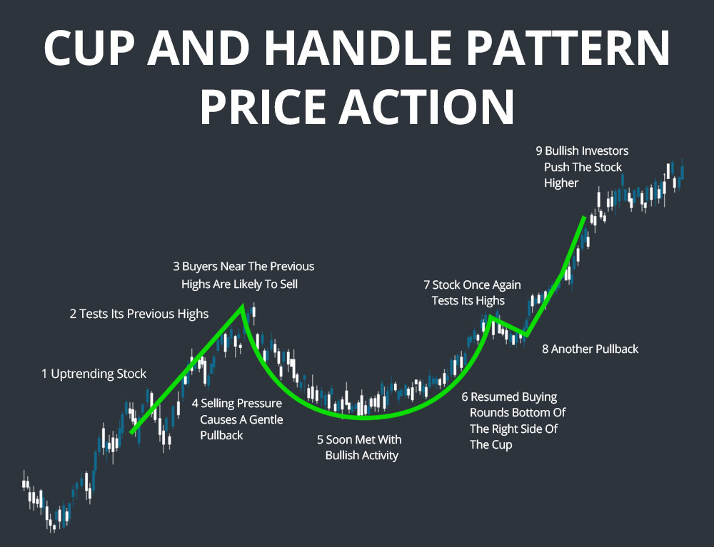 The cup and handle pattern is a bullish continuation pattern that consists of two parts, the cup and the handle. The cup typically takes shape as a pull back and subsequent rise, with the candlesticks in the center of the cup giving it the form of a rounded bottom. The handle is made up of downward-sloping price action that soon breaks out above the upper resistance line to indicate the continuation of the original bullish trend.