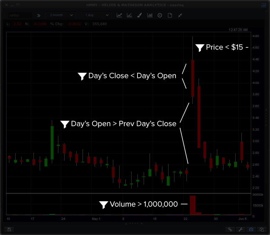 Of course, you don’t want to find stocks like $HMNY once the move is already over; you want to catch them when they are still hot. So, we will be looking for stocks that gap up and close red. Let’s get started.