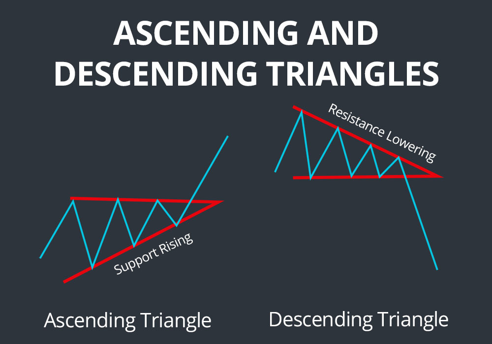 A symmetrical triangle requires at least four points – two highs, where the second high is lower than the first, and two lows, where the second low is higher than the first. In ascending triangles the highs are the same across the triangle rather than descending, while in descending triangles the lows are the same across the triangle rather than ascending.